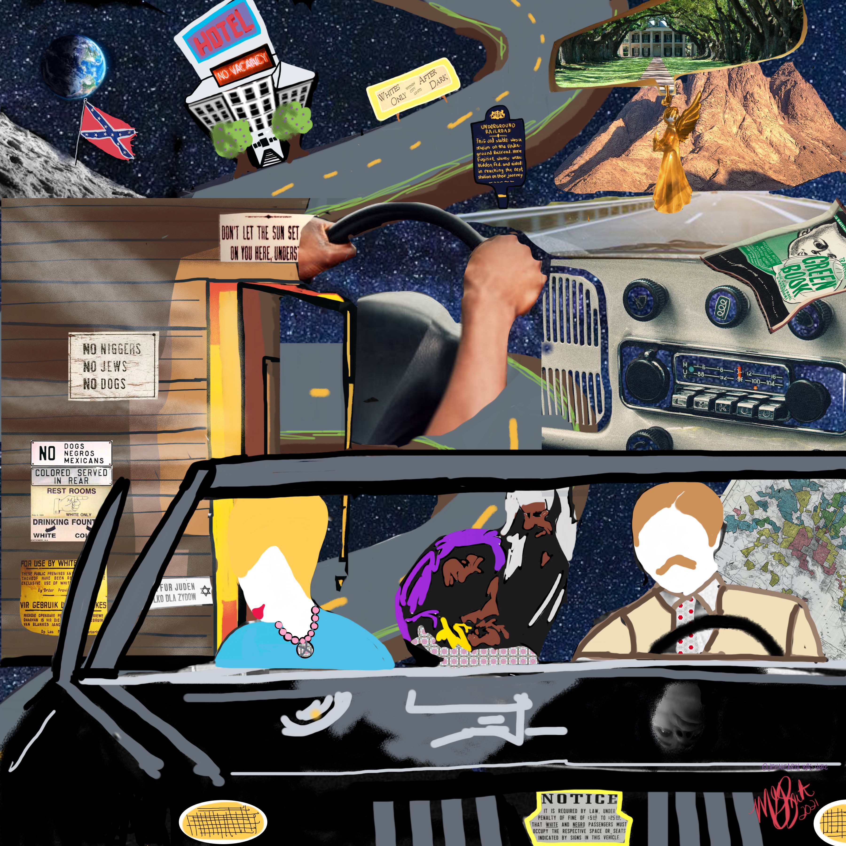 While I was driving South from Baltimore to Charlotte, and back, I listened to Overgound Railroad: The Green Book. My wife took a photo of my angel on my dashboard, and she drew a doorway while we hung out with the author. I am drawn to blueprints and roadmaps, how they help others on a journey through past and future. This mashup is a mixed media collage; hand drawing and vintage text and imagery. There are pieces scattered across Tezos. If I were the gan/ai, here are the images in my search to create The Dreamer Handbook. Green Book Baltimore redlining maps Vintage Cadillac Black Nativity Mt. Sinai Plantation Rearview mirror Winding roads Car radio dashboard Black hands Steering wheel Underground railroad Mason Dixon Segregation signs Universe Integration signs Apartheid signs Nazi Germany signs Moon No Vacancy signs Metaverse hotel NFT owner may resell and publicly/privately display the art. Owner may not reproduce, prepare derivatives, or distribute copies.