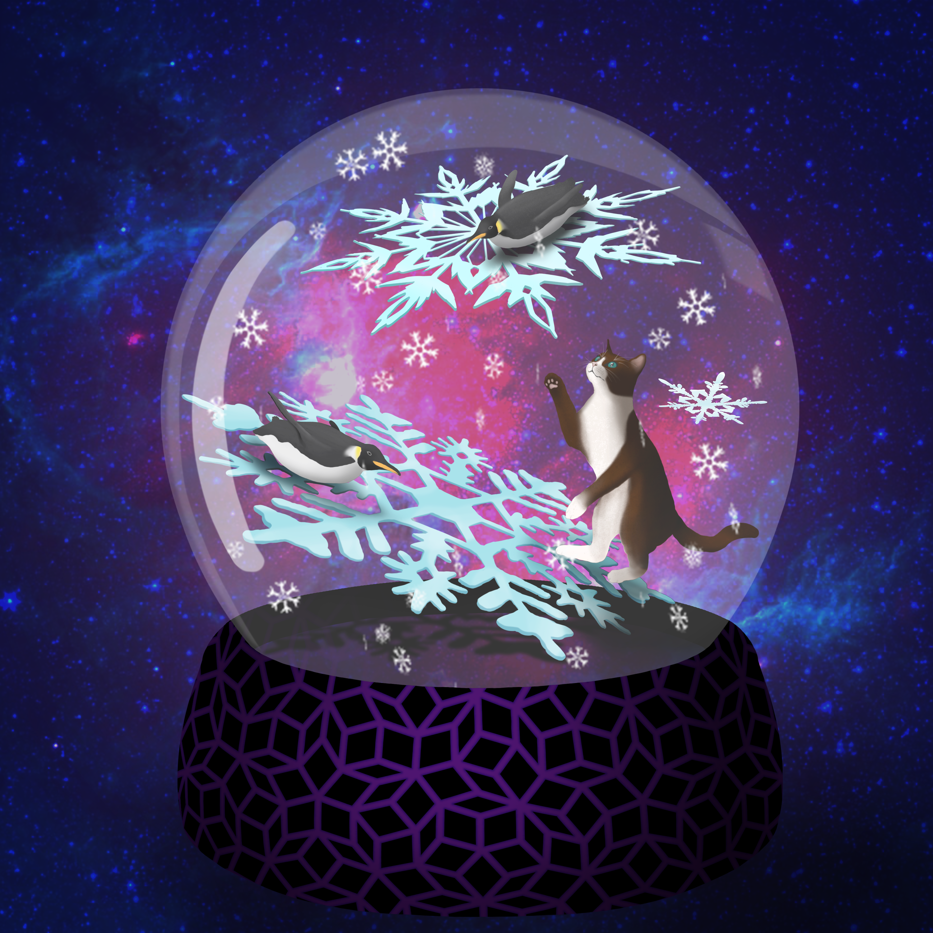 “BY ARTIST: MIRIAM REZA WWW.MIRIAMREZA.COM STRATEGIST: VIOLETSUMMER.ETH Des Femmes Snow Globes Holiday Collection celebrates women who are passionately pushing the boundaries and blurring the traditional lines between money and technology. Winter Crypto Kitties Snowglobe: A tribute to our community leaders and their smart - quirky fascinations on wealth, this 2D image is an ode to our members' obsession with cats, pudgy penguins and spacetime. ”