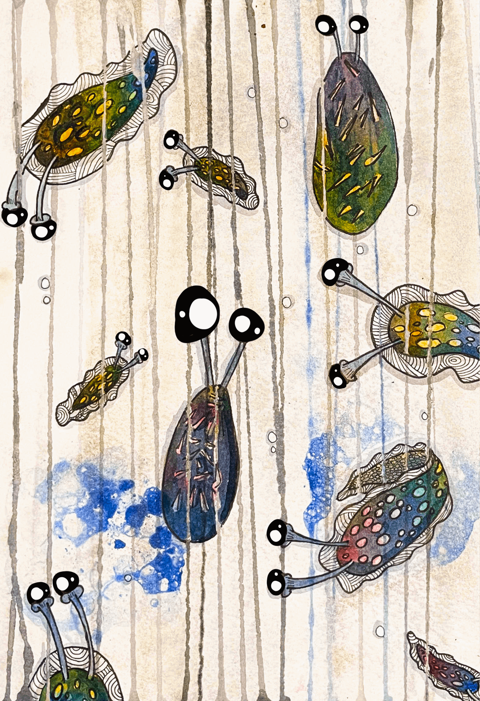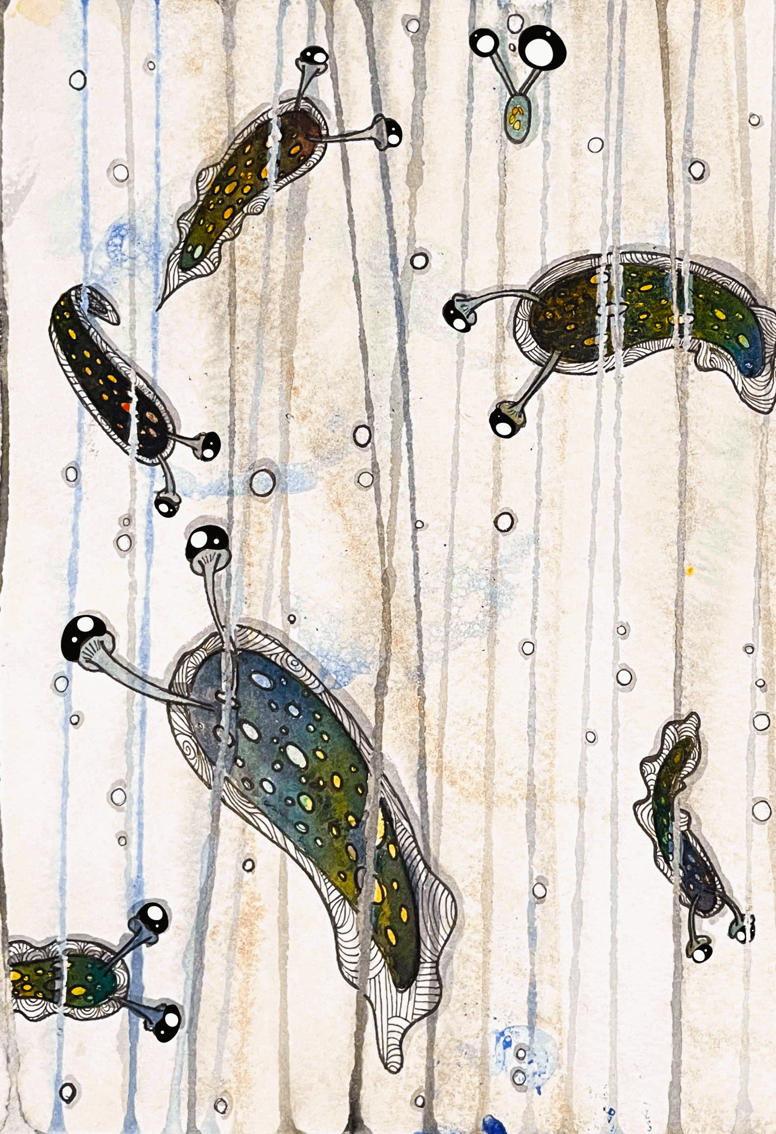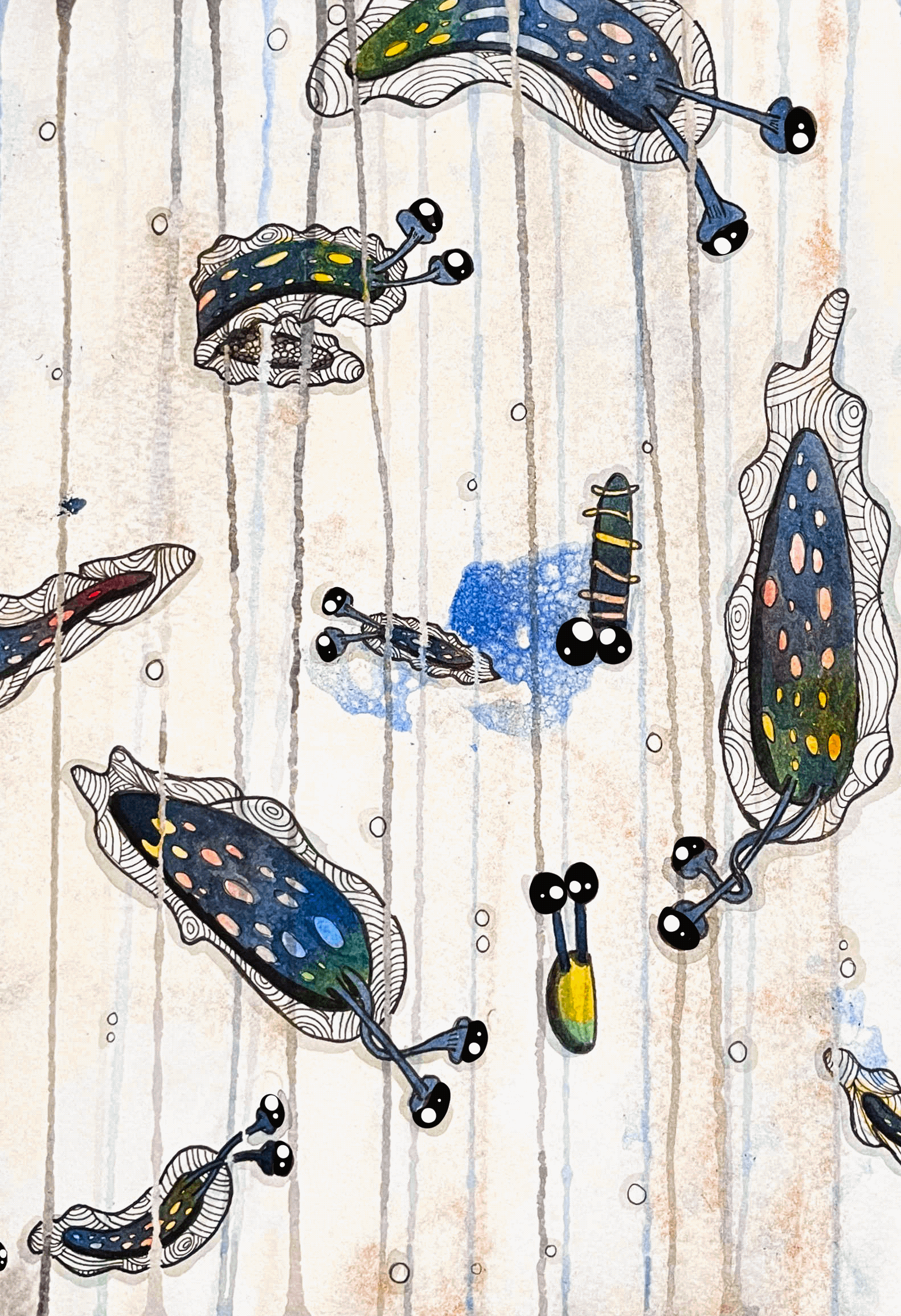 “2nd (out of 3) Art of the Day version of the Triptych of Natural Histories - Once Upon a Slug. Art by Lapin Mignon, Arthur, Leon, the rain and a slug.”