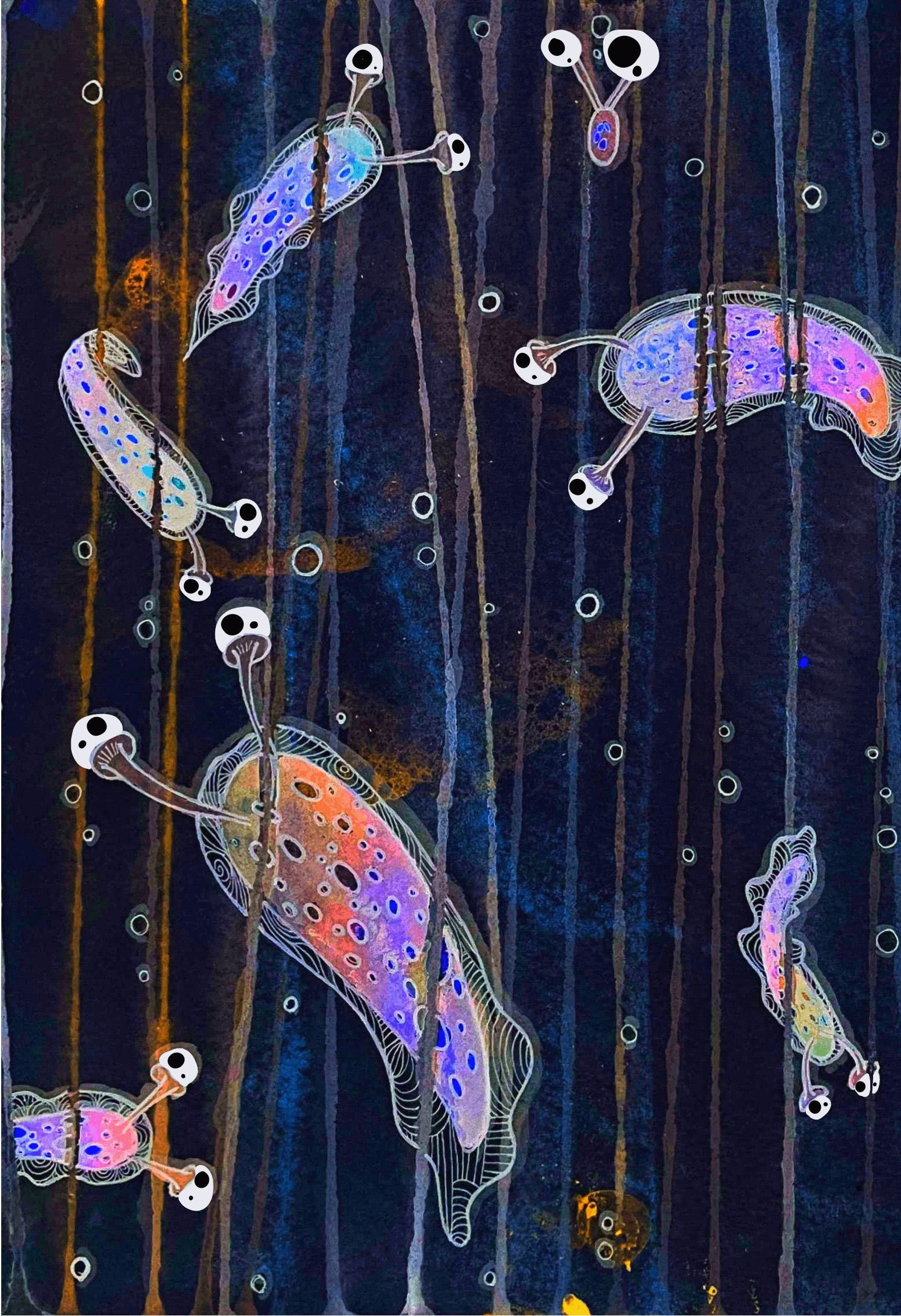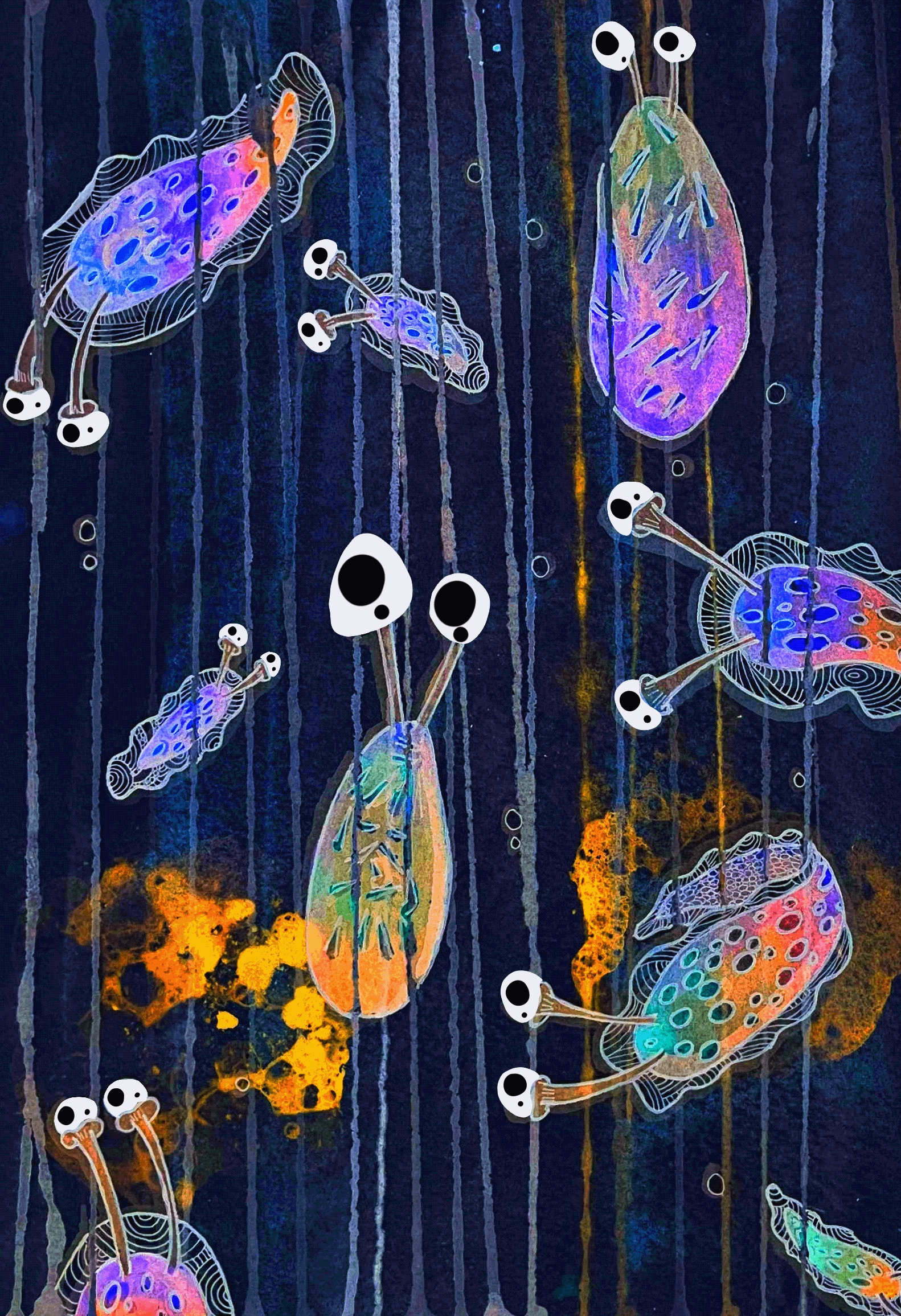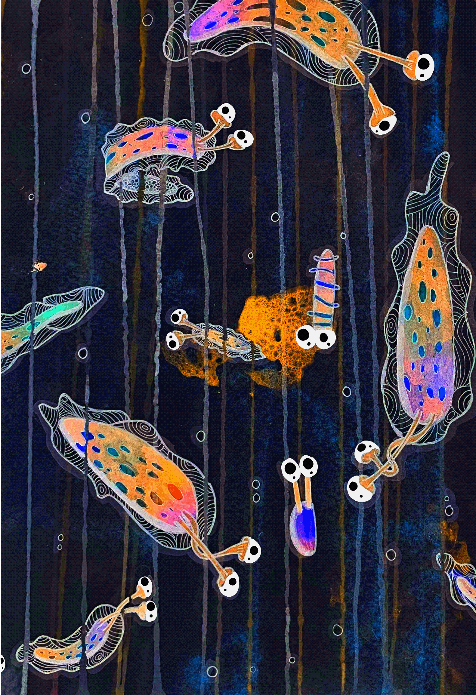 “2nd (out of 3) Art of Night version of the Triptych of Natural Histories - Once Upon a Slug. Art by Lapin Mignon, Arthur, Leon, the rain and a slug.”