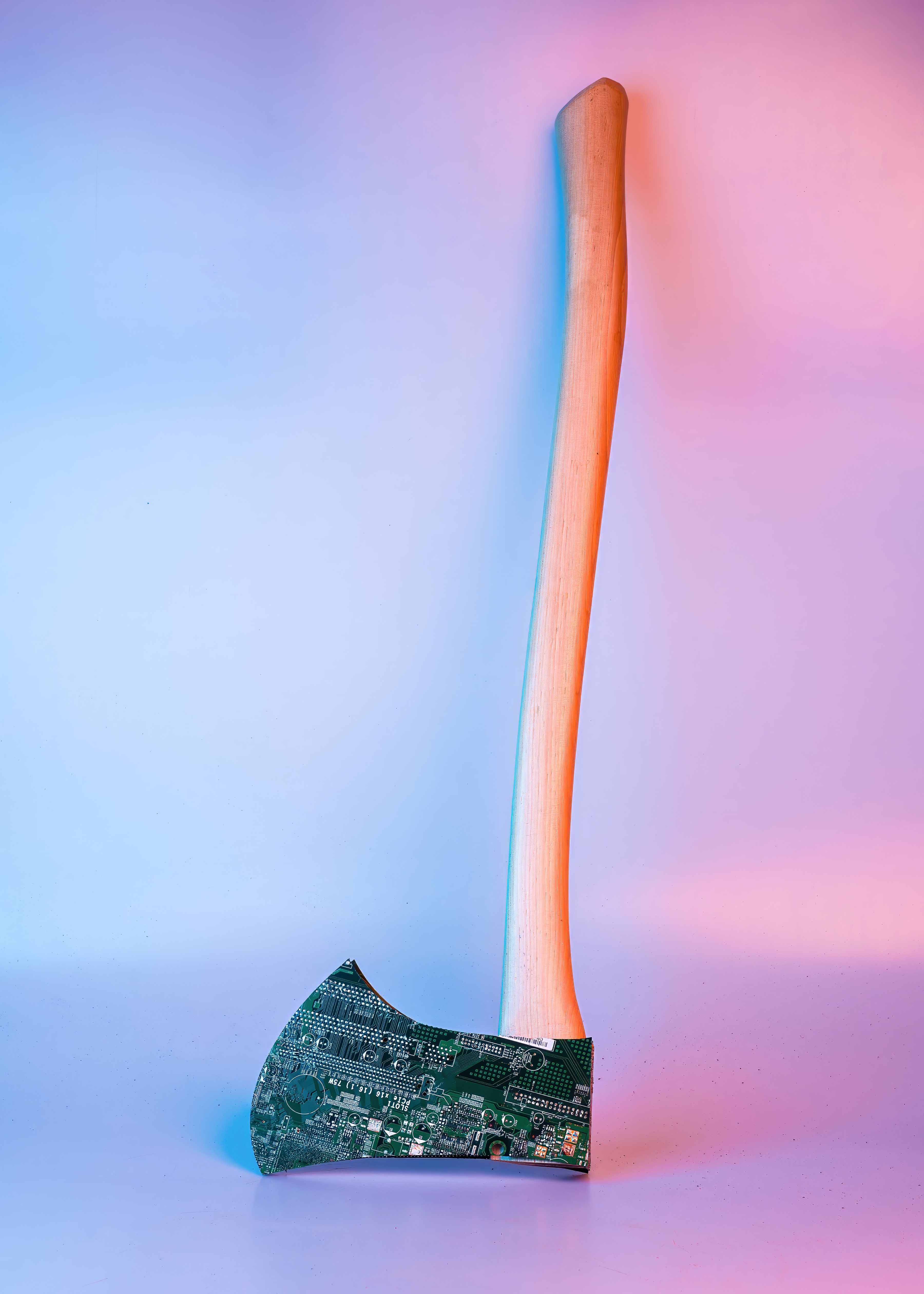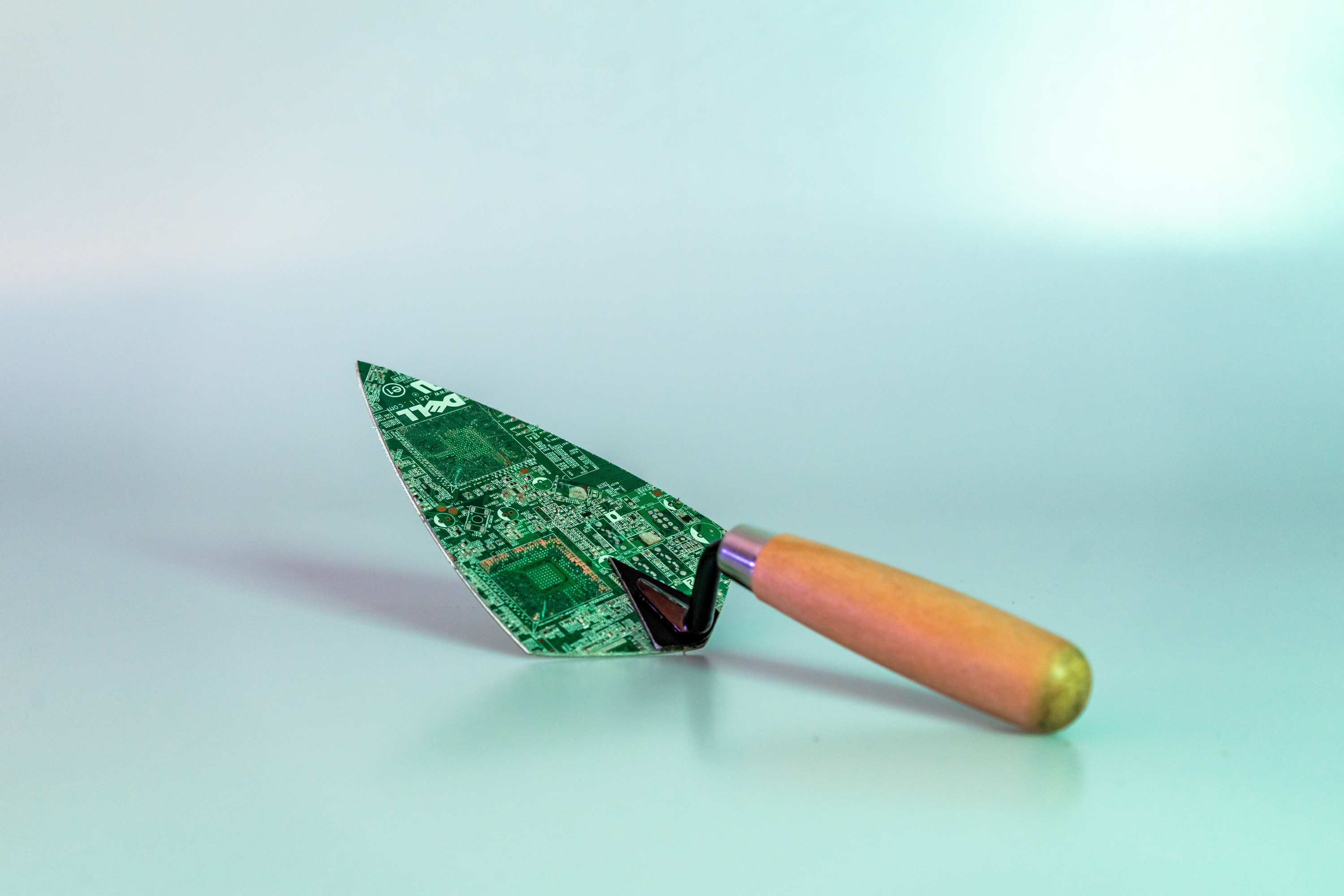 “digital photo: 3000 × 2000 px / sculpture (wood, metal, glue, motherboard): 6 x 15 x 2 in”