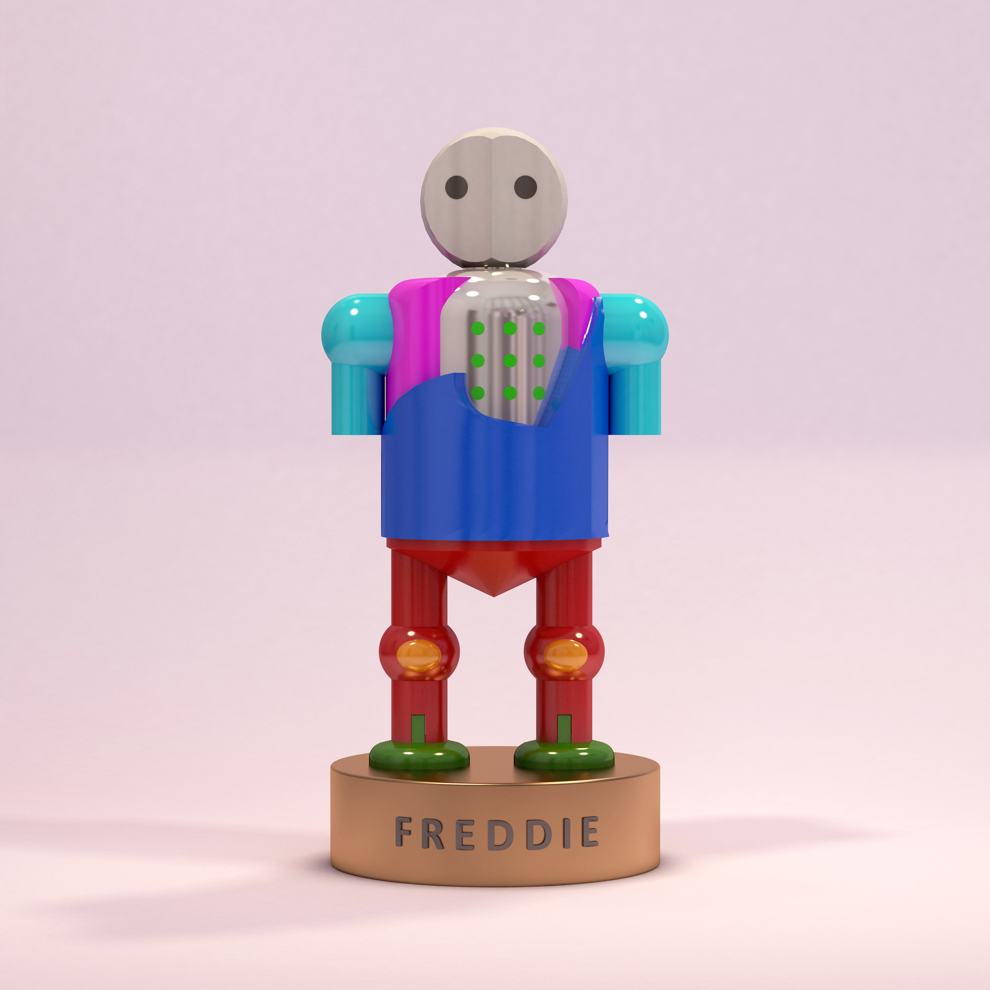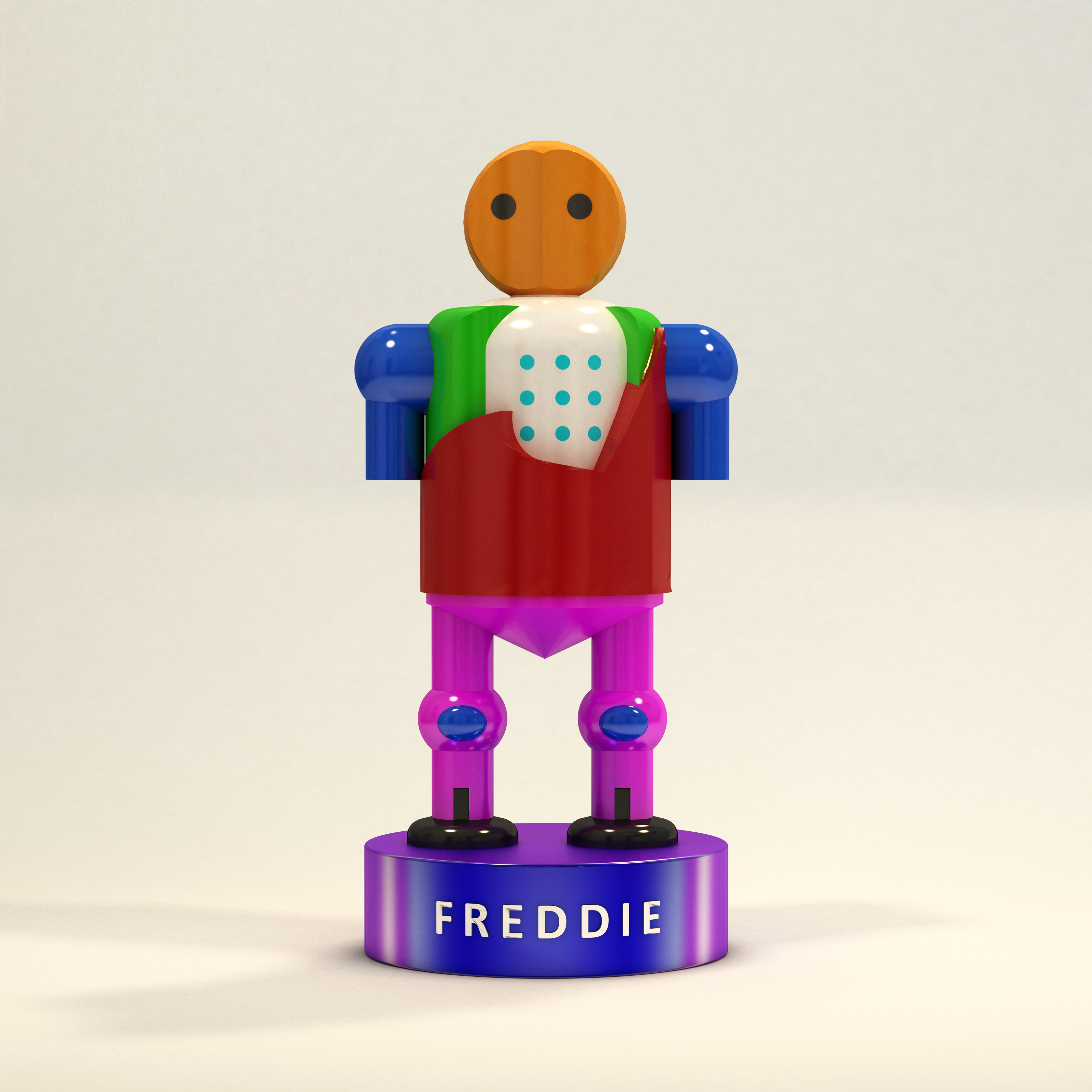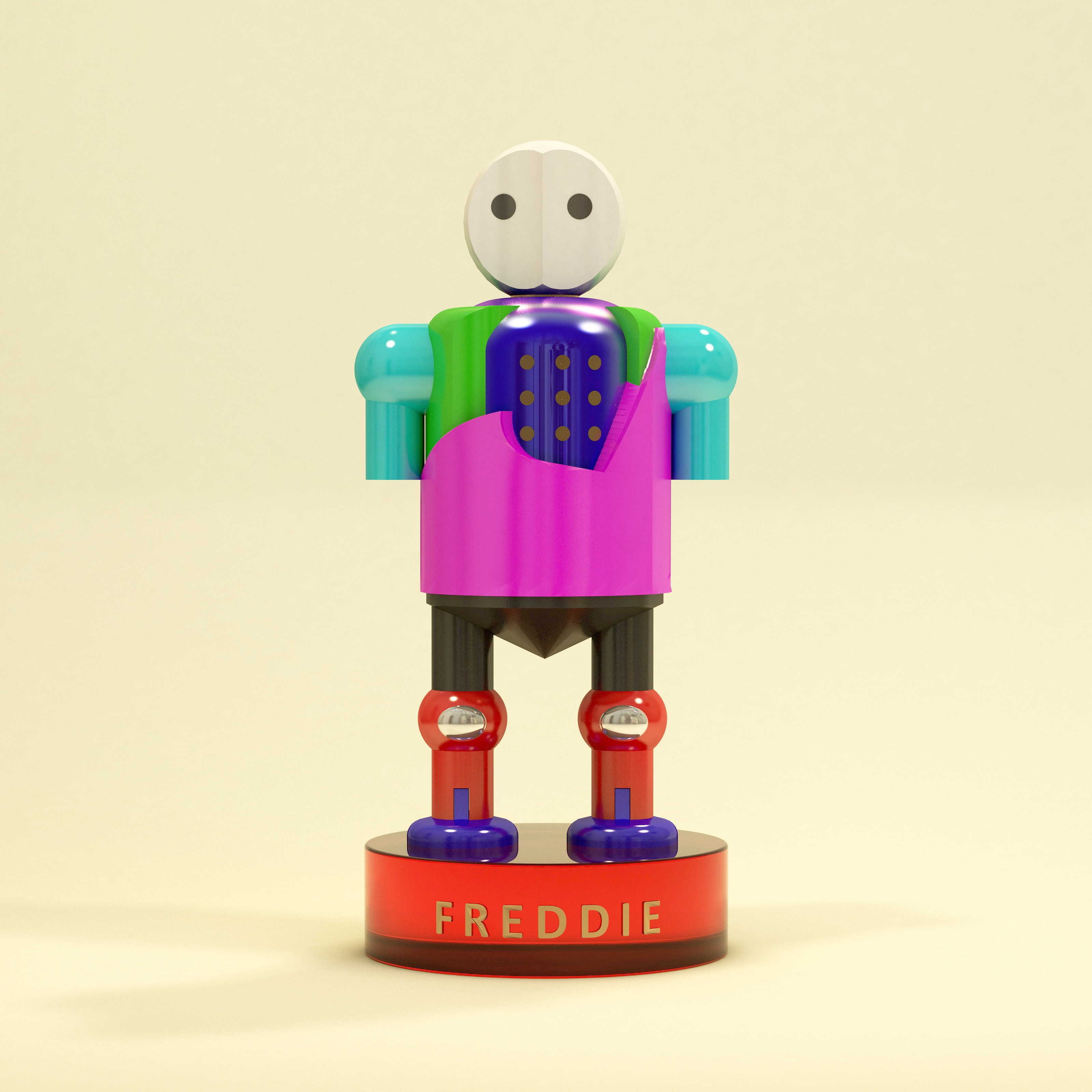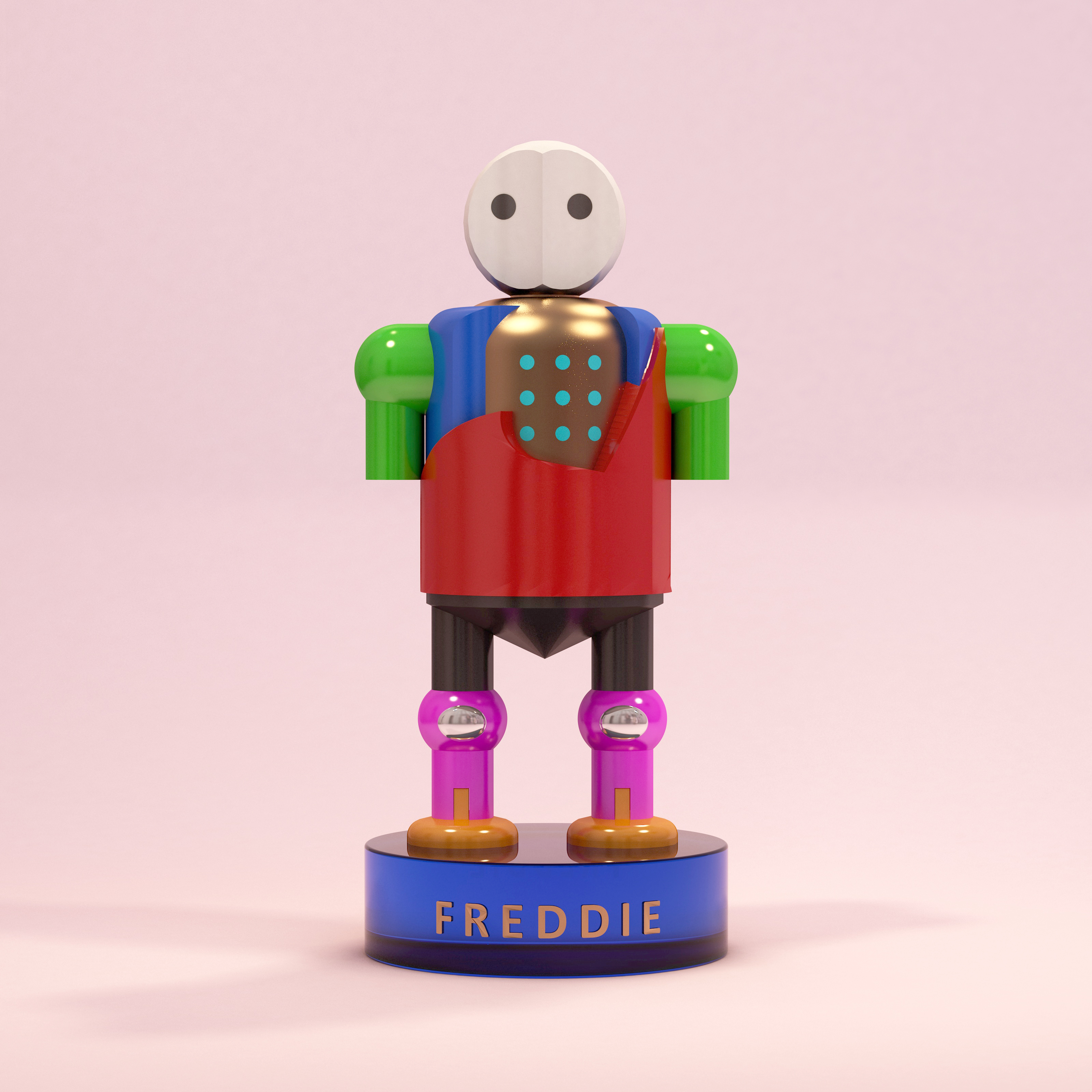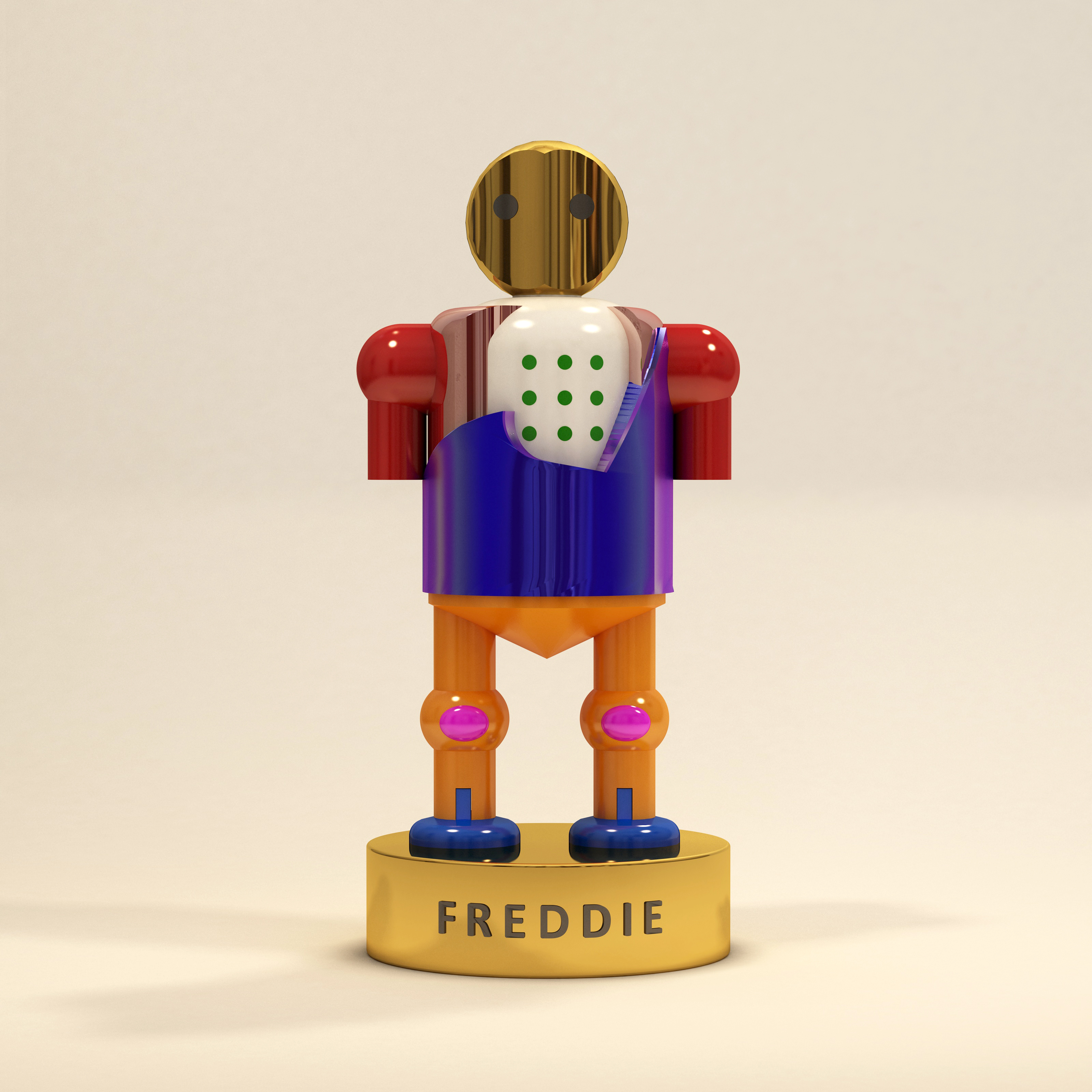 “This collection of eight digital sculptures is inspired by Dia al-Azzawi’s grandson, Freddie, whose enthusiasm for playing and interacting with the world around him is a source of constant joy for him. The work captures this enthusiasm in the form of a toy that any young child might want to play with, which also reflects the energy and passion of youth itself. In Dia’s own words: “I wanted to create a body of work that captures a young child’s energy using the traditional shapes and colours I grew up with. By embracing this connection between the old and the new, the (Freddie collection) allows me to leave a piece of my childhood in the metaverse for future generations to enjoy.” ”